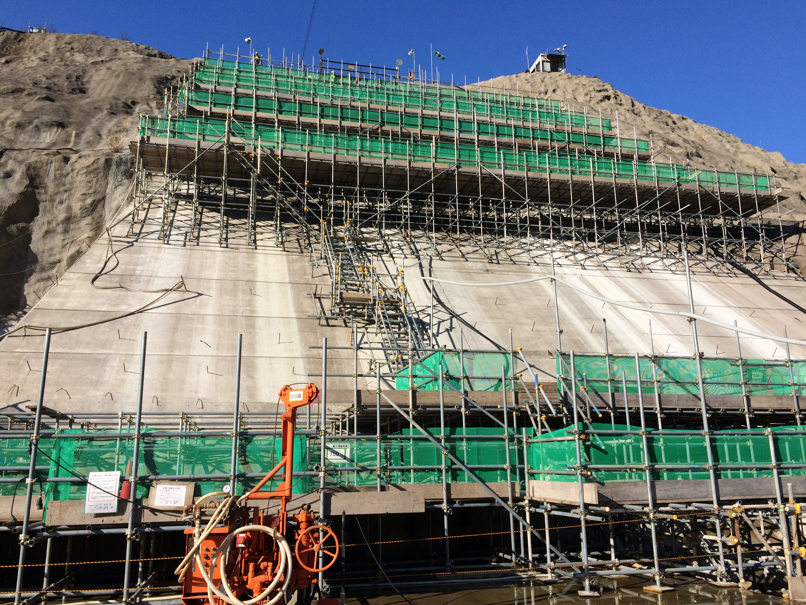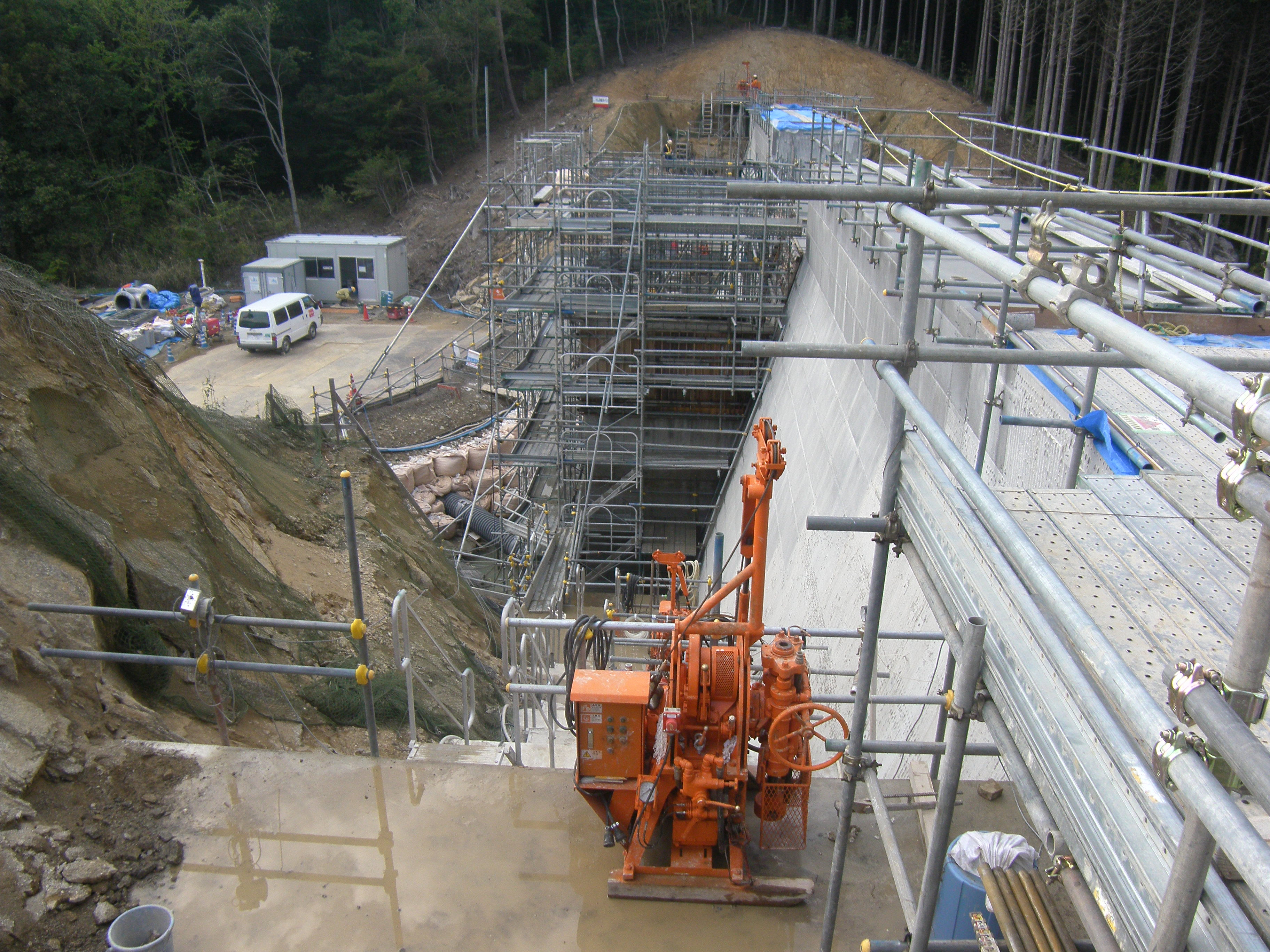 ダム建設で行う基礎処理工では「ボーリンググラウト」と言われ、 所定の深度まで注入孔をボーリングをする。この注入孔を利用して、 ダム基礎岩盤などの改良するため、セメントミルク等の注入材料を注入する一連の作業をする技能である。